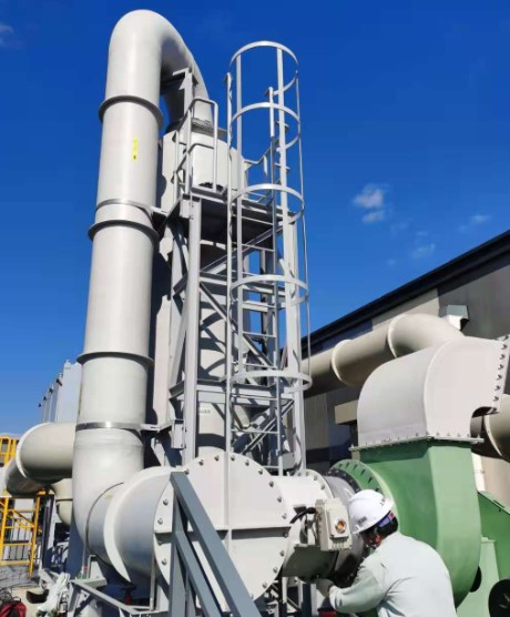 - 此工程是为该客户专门设计、制造并安装的一套高性能的废气处理系统。该套系统于2011年1月安装并通过试运行,此套系统采用协和FBS大型废气洗净塔 ,对高浓度酸、碱废气有极高的处理能力,塔体本身采用双段式处理结构,目前是协和在中国国内制造的最大型的处理系统之一。全系统满负荷处理排气上限为1500m3/min