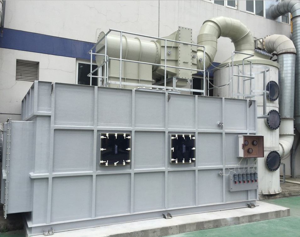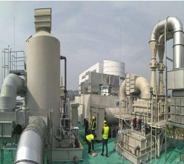 - 该工厂建设之初,引进并安装了协和化工株式会社的大量动力设备配合相关废气处理系统使用至今。 业主有着长期的我公司设备的使用习惯,设备自90年代使用至今一直保持着良好的运行状态。 2019年,由于新产线的追加,工厂出现对新产线无机废气排放处理的需求。我方随即按照业主要求,设计、制造并在业主现场安装了新的废气处理装置,针对制程区排出的酸性及粉尘废气进行有效处理。 该工程于2020年初完成,系统处理能力及使用状态得到了业主的深度好评及认可